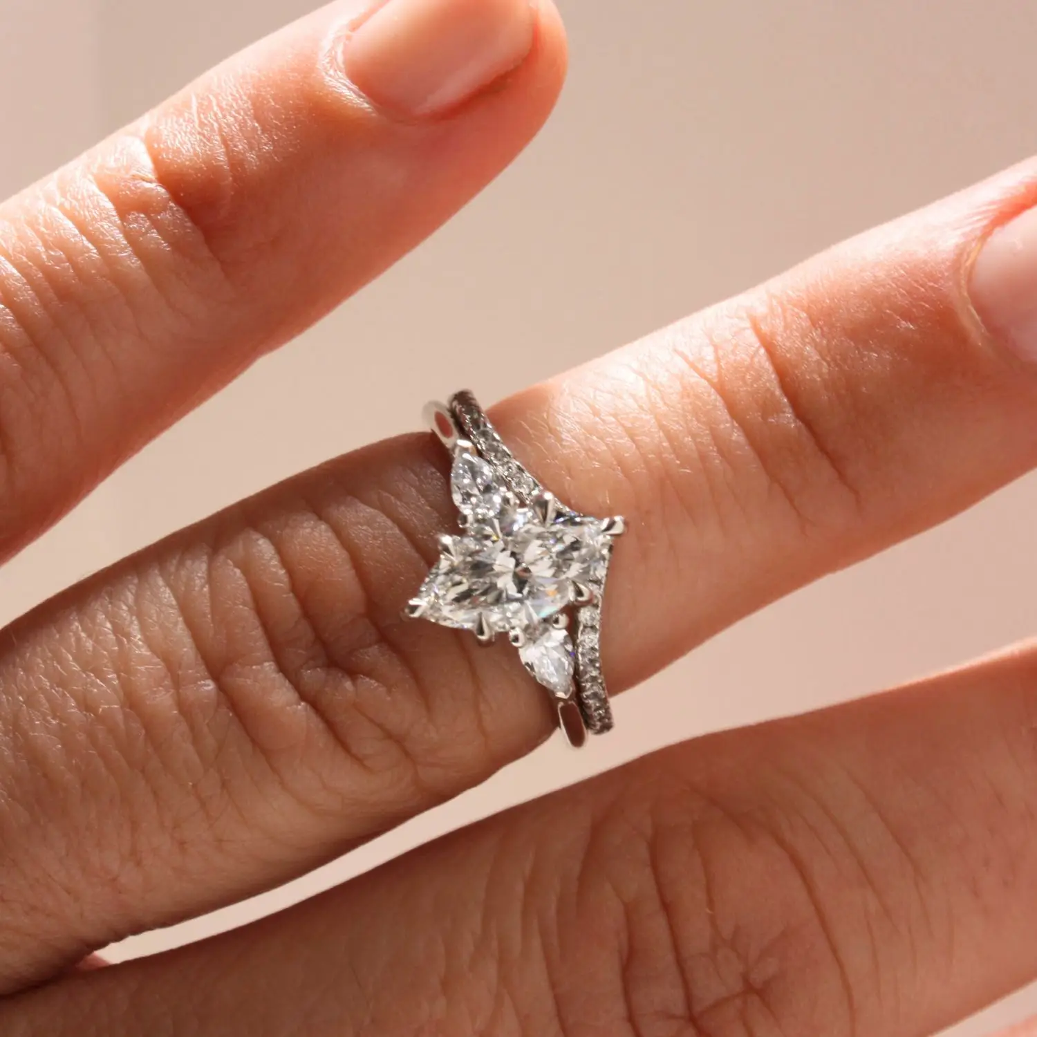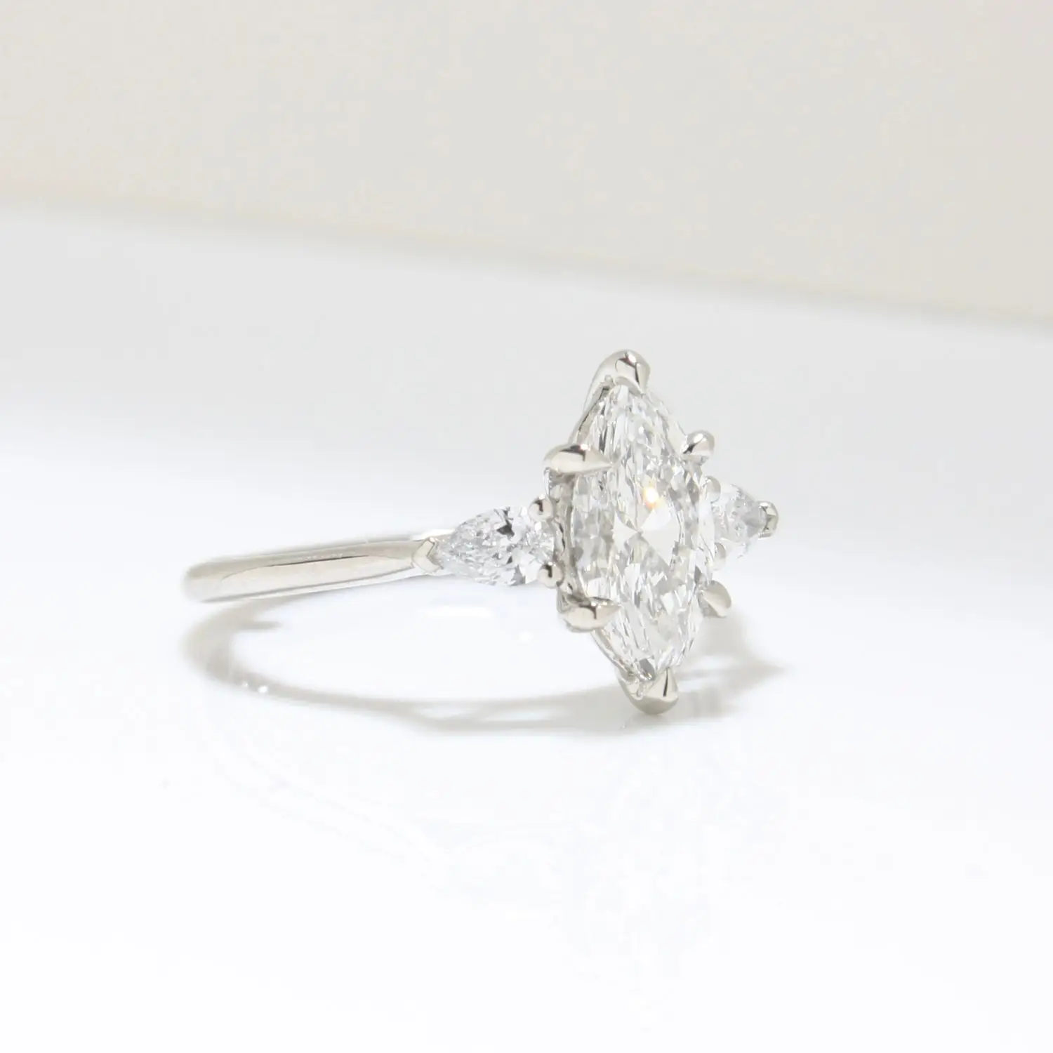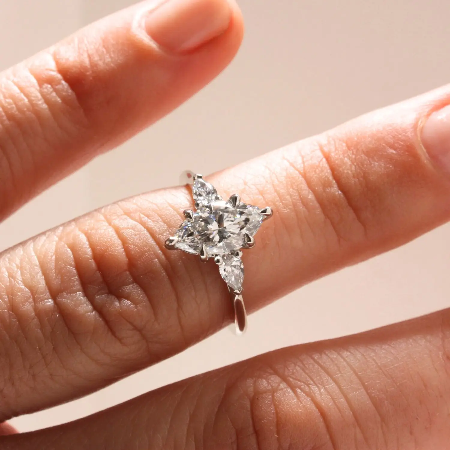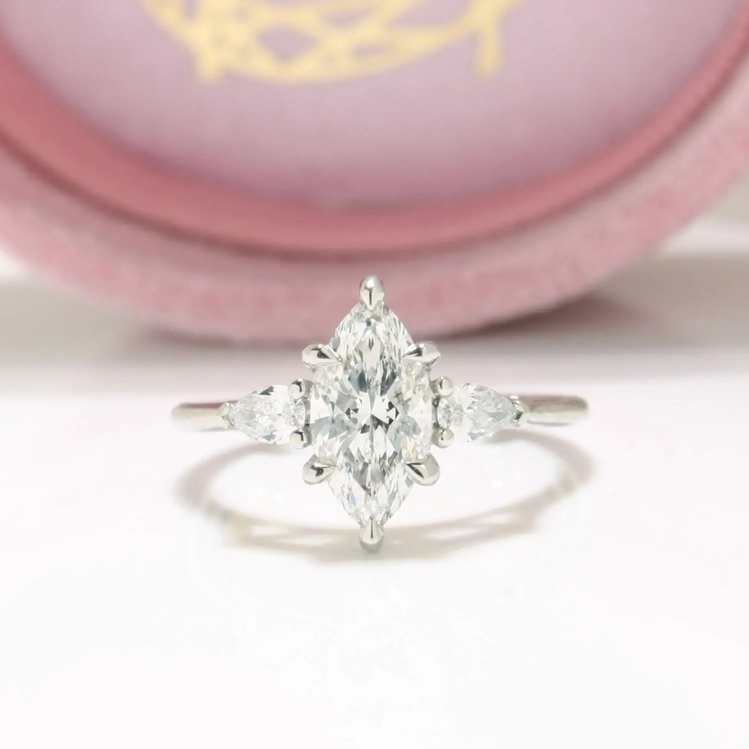 At its heart, a marquise brilliant-cut laboratory-grown diamond of your choice is gracefully framed by two pear brilliant-cut laboratory-grown diamonds, creating a silhouette of perfect balance and harmony. The sumptuously rounded band offers an indulgent comfort fit, while the elevated open gallery allows light to flow effortlessly through each stone — amplifying brilliance, sparkle, and captivating scintillation.