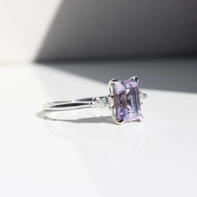 Celebrated for its timeless elegance and classic allure, our Trilogy Ring is a masterpiece of refined craftsmanship, exquisitely handcrafted from precious recycled gold and platinum in our Johannesburg studio. An emerald-cut centre stone of your choice takes centre stage, gracefully flanked by two pear-cut mined diamonds, each representing the past, present, and future. The sumptuous, fully rounded band and soaring open gallery create a luminous display of brilliance and scintillation, making this ring a sublime expression of enduring luxury and romantic sophistication.