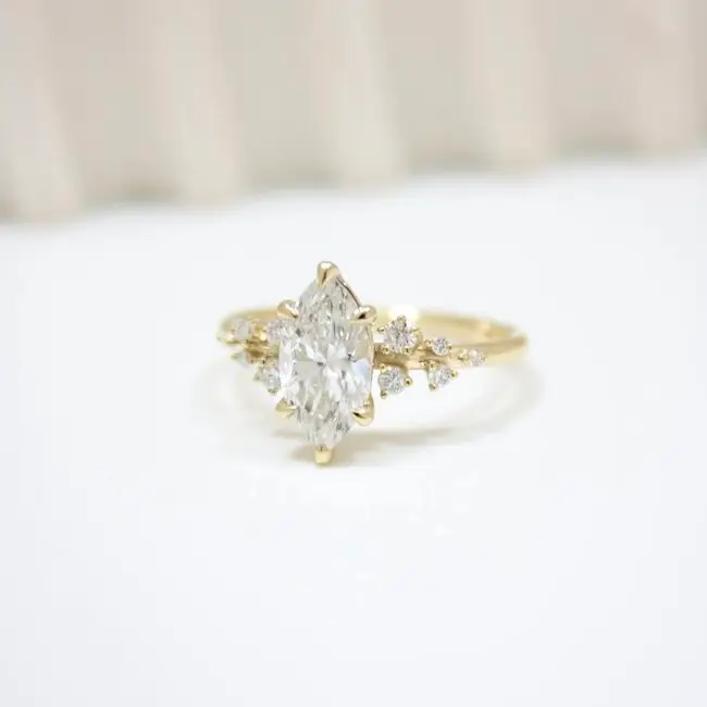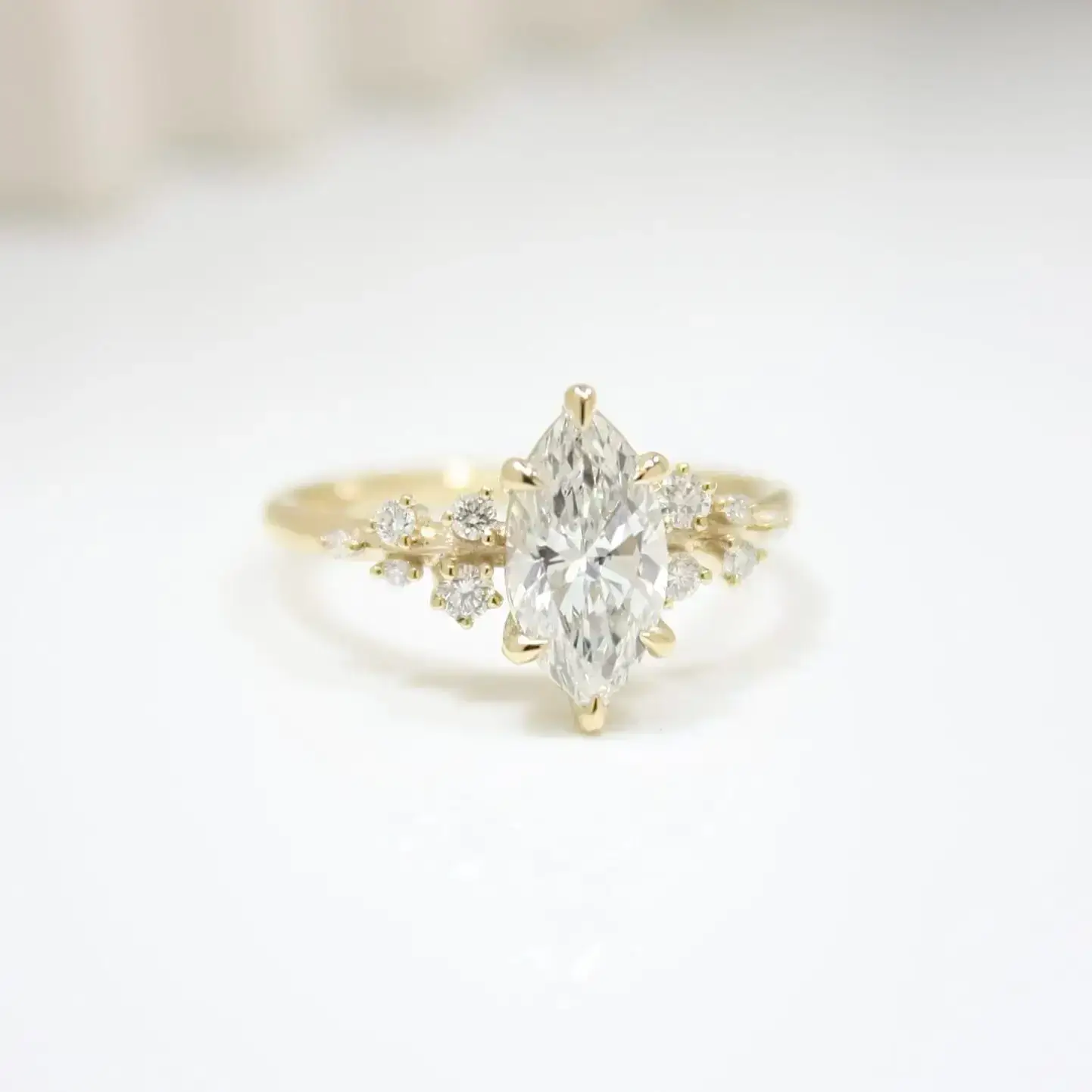 Our Cosmos Ring is a celestial celebration of radiant beauty. Exquisitely handcrafted in our Johannesburg atelier from precious recycled gold or platinum, a constellation of round brilliant-cut diamonds appears to float effortlessly along a graceful, fully rounded wire band. At its heart, a marquise-shaped centre stone of your choice is set within a refined open gallery, inviting light to cascade through every facet and igniting an extraordinary display of scintillation and sparkle.