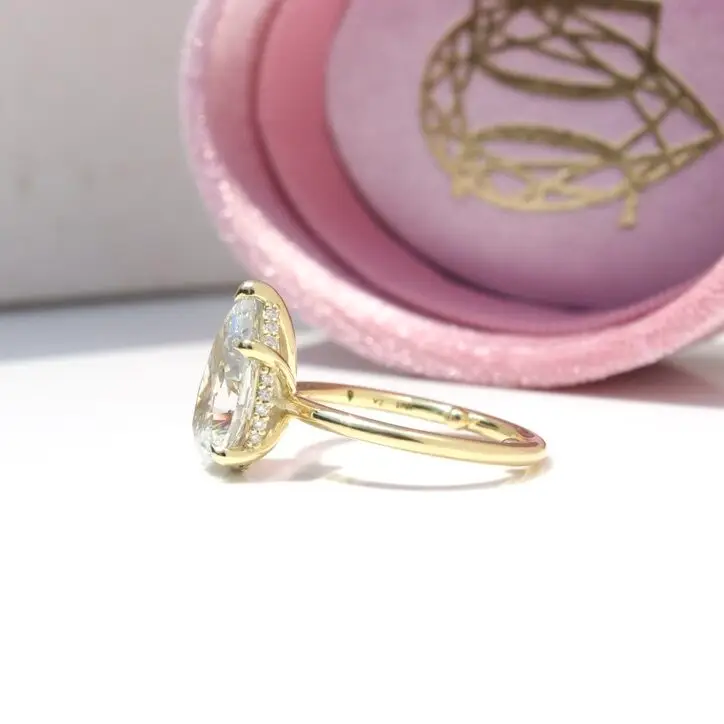 Invisible at first glance, the hidden halo is a secret detail waiting to be discovered. A delicate halo of melee diamonds is nestled beneath a pear-cut centre stone of your choice, held aloft by sleek cat claws within a refined open gallery rising elegantly upon a luxurious recycled gold or platinum band. Elegantly handcrafted in our Johannesburg atelier, our Hidden Halo Ring is a subtle celebration of brilliance, sophistication, and timeless luxury.