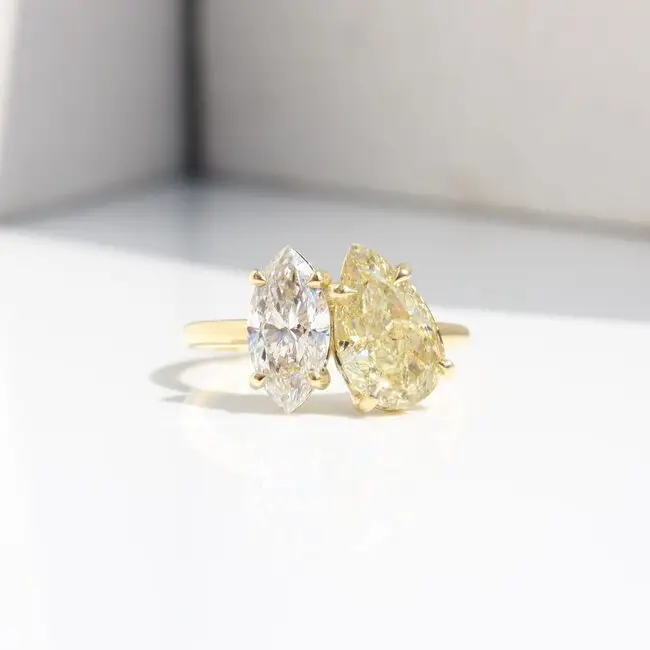 Embraced throughout history by some of the world’s most celebrated couples, our Toi et Moi Ring is the ultimate symbol of enduring love and contemporary elegance. Exquisitely handcrafted in our Johannesburg atelier from precious recycled gold and platinum, a pear and marquise centre stone of your choice are hand-set into a refined open gallery, rising from a sumptuous fully rounded band. A luminous expression of two souls intertwined.