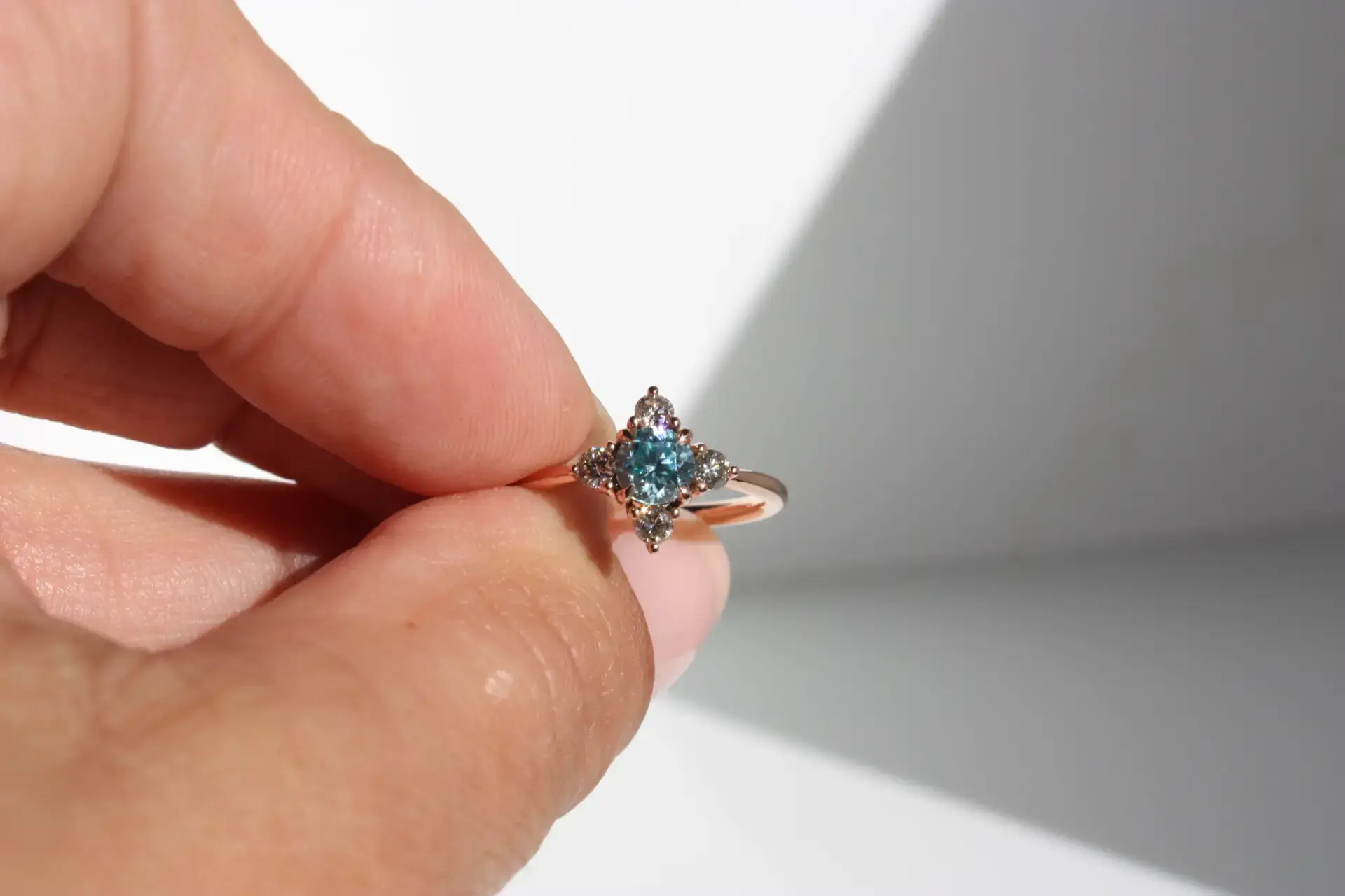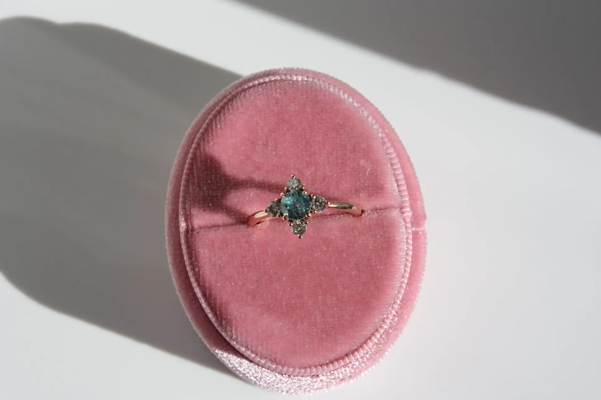 Our Compass Cluster Ring features a captivating round centre stone of your choice, gracefully set upon a luxurious, fully round, tapered band crafted in precious recycled gold or platinum. At each cardinal point, the centre stone is embraced by four individually hand-set round brilliant-cut white diamonds, each one chosen for its exceptional brilliance. These diamonds add a breathtaking layer of sparkle and sophistication, enhancing the radiance of the centre stone. This ring exudes timeless luxury and extraordinary craftsmanship, destined to be a treasured heirloom.