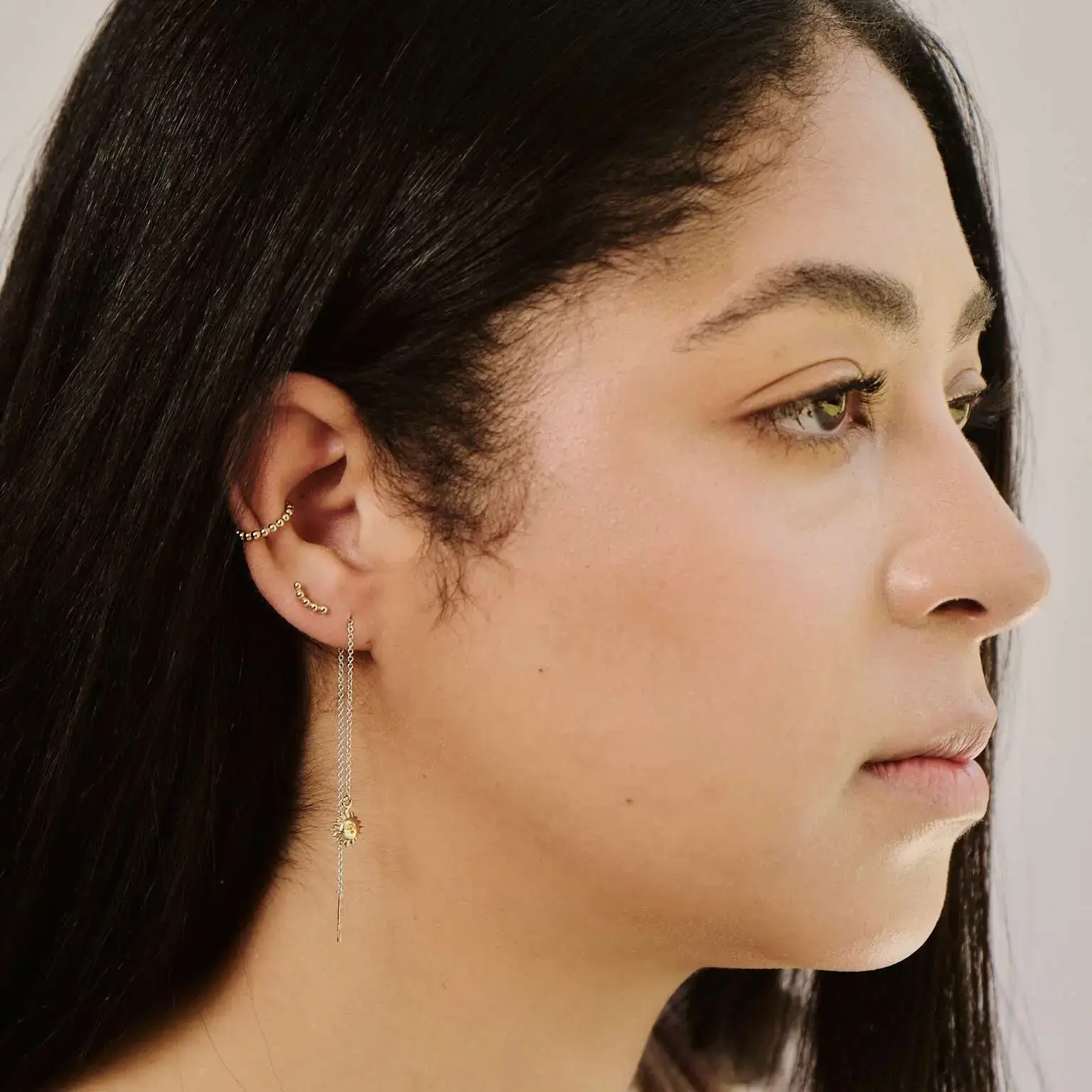 Inspired by a vintage charm bracelet passed down through generations, and reimagined as our Sun Threader Earrings. Suns crafted in precious yellow gold sway gently back and forth, skilfully suspended from a single strand of white gold chain, allowing the sun charms to catch and reflect the light. Long enough to be threaded through the ear once or twice, creating a delicate loop of chain, these earrings are a must-have for nights out and weekend outings.